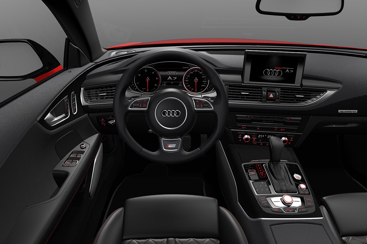 아우디 A7 스포트백 3.0 TDI 컴피티션의 인테리어는 S라인 스포츠 패키지의 스타일에 맞춰 블랙으로 디자인됐다. 스포츠 시트는 블랙 또는 루나 실버 색상의 화인 발코나 가죽으로 마감되고 S라인 엠보싱으로 장식된다. 아우디는 미사노 레드 또는 아게이트 그레이 색상의 콘트라스트 스티치가 가미된 S 스포츠 시트를 옵션으로 제공하는데, 이 경우 암레스트도 콘트라스트 스티치가 가미된 가죽으로 마감된다. 인레이는 매우 높은 수준의 금속/우드 콤비네이션인 알루미늄과 블랙 색상의 보퍼트 우드로 구성된다. 도어 실 트림에는 “quattro” 로고가 각인된다. 다기능 스포츠 스티어링 휠 뒤쪽에 부착된 시프트 패들로 8단 팁트로닉의 기어 단수를 수동으로 선택할 수 있다.