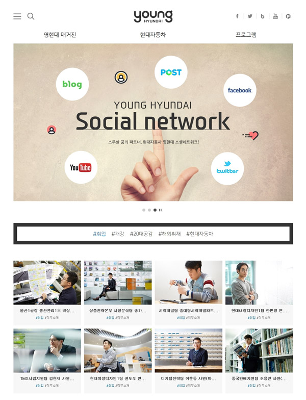 한편, 현대자동차는 영현대 홈페이지, 블로그, 페이스북, 네이버포스트, 트위터 등 여러 온라인 채널을 통해 20대가 공감할 수 있는 다양한 콘텐츠를 제공하고 있다.