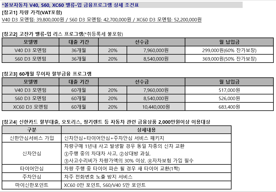 프로모션 대상 차종은 볼보자동차 V40, S60, XC60 의 D3 모멘텀 트림이며, 고객들은 필요에 따라 잔존가치 보장형 리스 또는 60개월 무이자 할부금융 두 가지 중 원하는 프로그램을 선택할 수 있다.