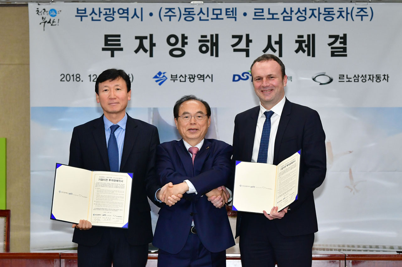 18일 오후, 르노삼성자동차(대표이사 도미닉시뇨라)는 부산시청에서 부산시, 차체부품 전문 제조업체인 ‘㈜동신모텍’과 초소형 전기차 ‘트위지’ 생산시설 부산 이전 및 일자리 창출을 위한 공동협력 업무협약(이하 MOU)을 체결했다.