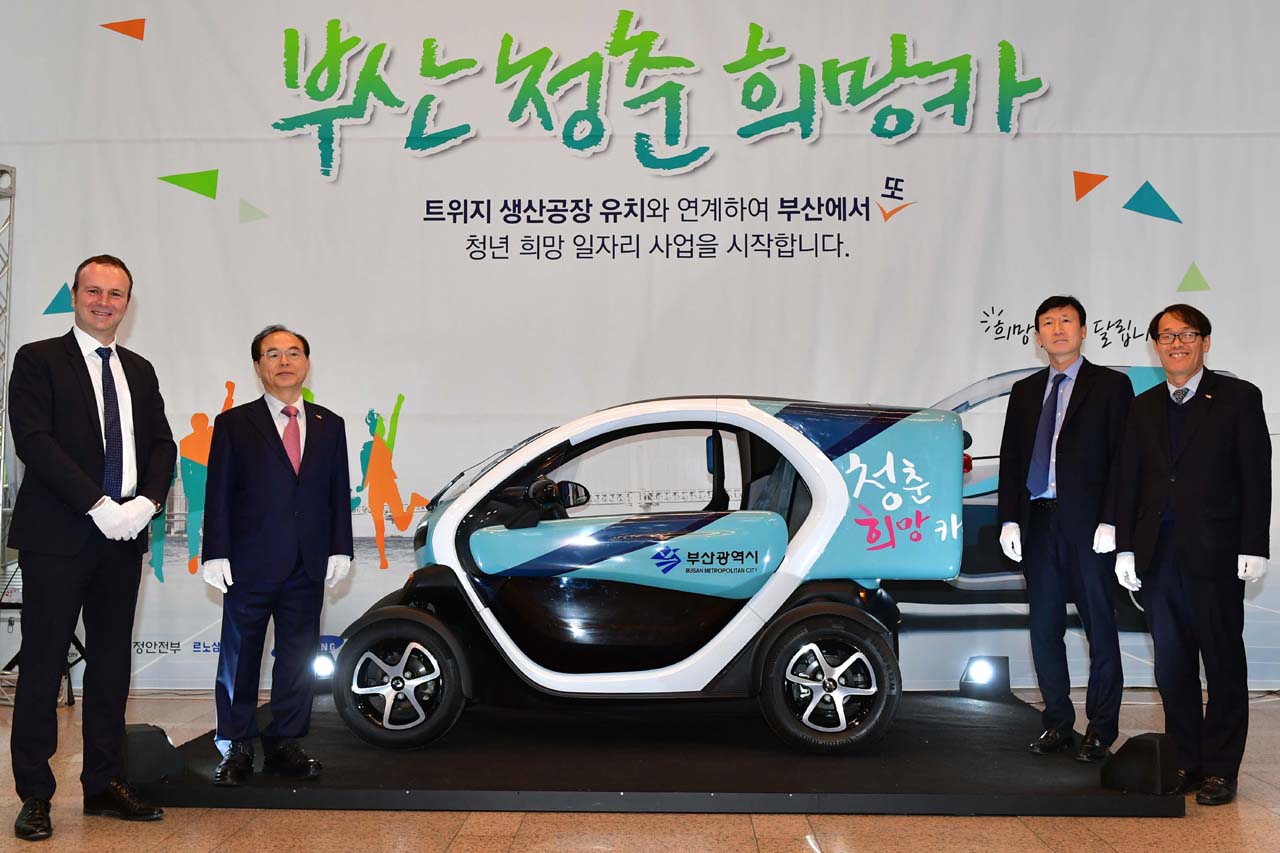 또한 르노삼성자동차는 트위지를 활용해 19년도부터 운영되는 청년 일자리 사업인 부산 청춘희망카 시범운영에 트위지 300대를 지원할 계획이다. 청춘희망카는 SM3 Z.E.를 활용한 청춘드림카에 이은 2번째 부산시 전기차 활용 청년 일자리 창출 사업으로 초소형 전기차 개조, 교육 및 인건비 지원을 통해 유통기업 청년 취∙창업을 지원하고 미세먼지 저감을 위한 친환경 물류의 뉴 트렌드를 제시하는 사업이다.