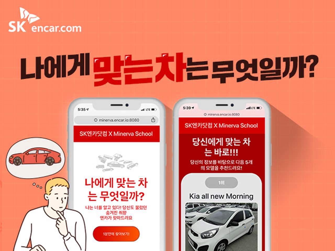 SK엔카 직영 중고차몰 SK엔카닷컴이 미네르바 스쿨 학생들과 개발한 알고리즘이 적용된 베타 서비스를 20일 SK엔카 웹사이트와 모바일 앱에서 공개한다. 해당 서비스를 통해 소비자는 자신의 성향과 어울리는 차 모델을 추천 받을 수 있다.