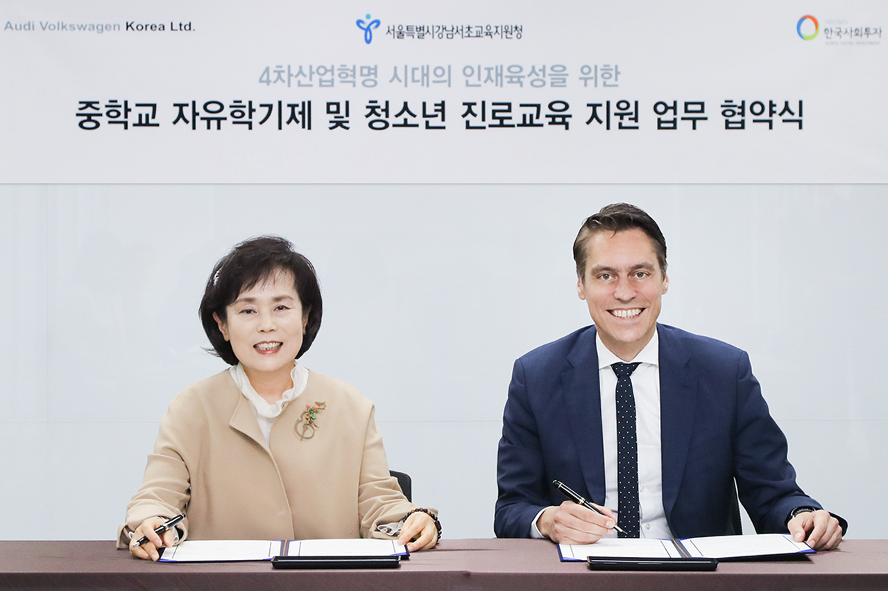 이날 협약식에는 르네 코네베아그 아우디폭스바겐코리아 그룹총괄사장과 이윤복 서울시강남서초교육지원청 교육장, 한국사회투자 관계자 등 회사 및 기관 관계자들이 참석했다.