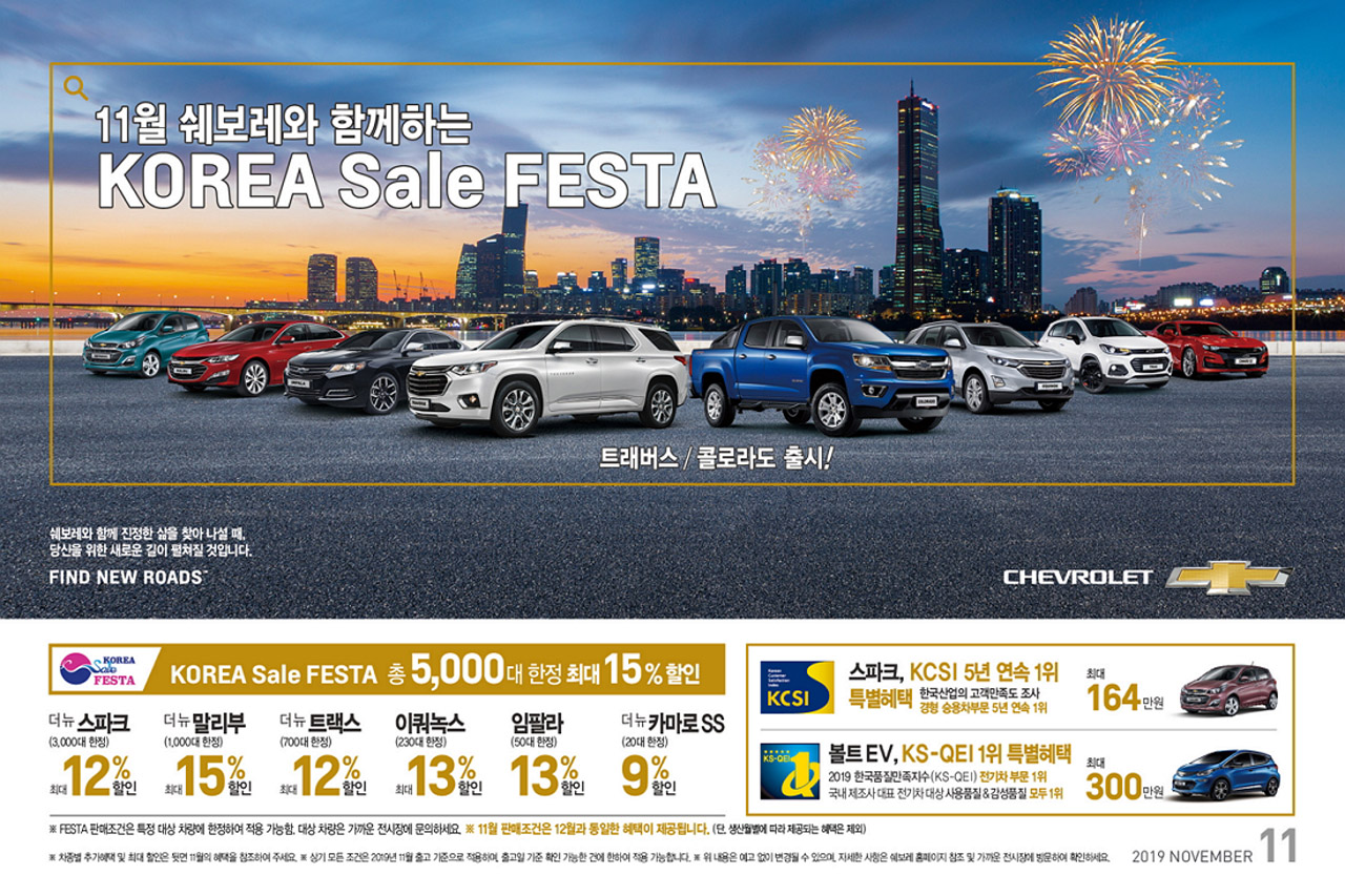 쉐보레(Chevrolet)가 11월, 차종에 따라 최대 15% 할인 등 올해 최고 수준 혜택을 제공한다. 이는 쉐보레가 국내 최대 쇼핑 축제인 ‘2019 코리아 세일 페스타(Korea Sale Festa)’에 참여하기로 한데 따른 것.
